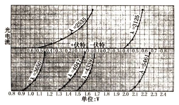密立根的实验结果:6根曲线分别对应于汞的6根特征谱线(横坐标为电压,纵坐标为光电流)(图片来自网络)