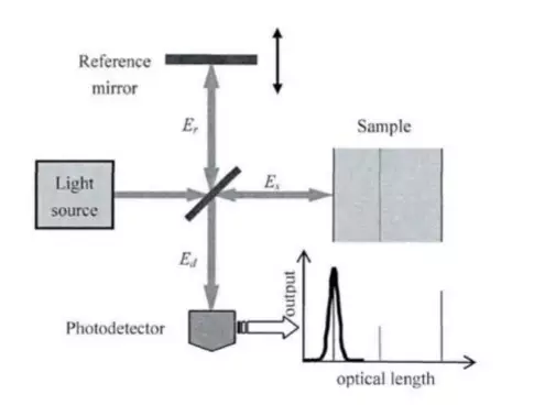 相干层析成像模式的核心部件包括宽带光源、迈克耳孙干涉仪和光电探测器,其轴向分辨率取决于宽带光源的相干长度,一般可以达到1~10μm。由于光源为低相干宽带光源,故其相干长度极短。而只有当参考臂和测量臂光程差在光源的一个相干长度之内时,背向散射光和参考光才会产生干涉,且当光程差接近零时才具有最大相干强度(具体原理请查看第2期:什么是激光的相干性,我发现已经好几次提到其他期的内容,说明光的很多内容都是相关的)。因此,随着参考镜的轴向移动,可选择样品中与之光程相等的层来进行成像,而其他层的信息将被滤掉,从而实现了层析成像。