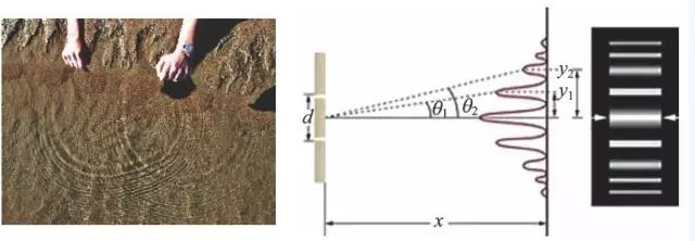 图12. 水的表面张力使得水面可以轻松地激发出波来。来自两个源的水波表现出相干条纹,这启发了所谓的光的双缝干涉及其解释。