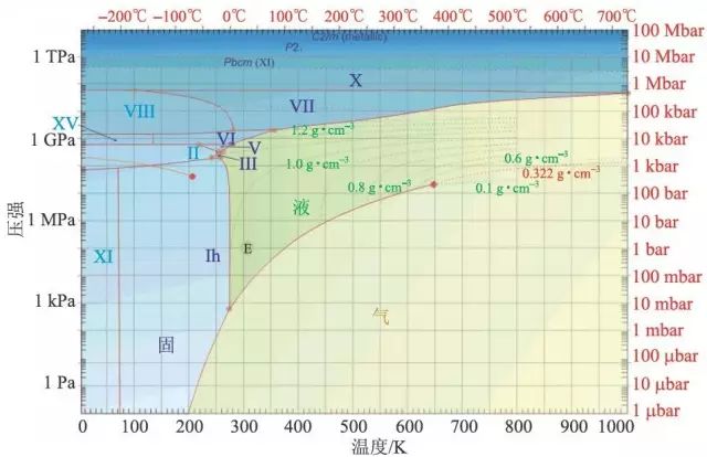 对一种物质的初步理解见于该物质的 p —T 相图。图8 是一般热力学教科书中简化的水的 p —T 相图,其气液固三相共存的点(TP)对应固定的气压和温度(T),这个温度 Tc=273.16 K 是绝对温标的唯一参考点。气液两相的分界线终结于处于(218 atm.,647 K)的临界点(CP),在此处右上角一定 p—T 范围内的水处于超临界状态,具有极大的且灵敏地依赖于 p—T 的溶解度。水的液固两相界限的斜率 dp/dT<0,这一点就已经异于大部分其它物质了。重要的是,一般物质的液相和固相可能只有一种或者不多的几种不同结构,而水的结构却是出乎意料地复杂。