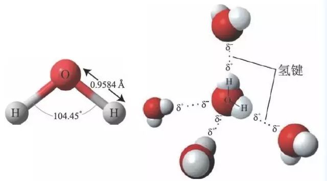 人类对水充满了好奇,想知道它是什么样的物质,直到有一天化学家发现氢气和氧气一起燃烧得到的就是水。水分子为 H2O,是三原子分子,两个氢氧键的键长 ~ 0.96 Å,夹角约为 104.45°,很简单、很无辜的样子(图5)。然而,这种分子的简单是一种极具欺骗性的简单,由其构成的水的性质之奇异与复杂却让科学家头疼不已。在聚集体中,水分子会和多达 4 个其它水分子通过氢键相结合(图5),水分子会形成大小不同的团簇(图6),且这些团簇是动态的,在皮秒(1 ps=10 -12 s)量级的时间尺度上不断地分裂、重组。水分子中 H—O 键的键长和键角,以及分子间氢键的键长与取向,都可以在较大的范围内灵活地调节。因此,也就容易理解为什么水有复杂多样的结构了。
