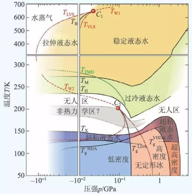 不过,如果考虑到压力这个强度量还是极性的,即可正可负,注意到水会表现出不同结构的液相和非晶相,我们还可以得到水的无定形相的相图(图10)。考虑到内容的复杂性,此处只做简单的介绍。水在零度以上的液相也存在液—液一阶相变。由于水存在过冷态,则水在摄氏零度以下也有液态。水可以坚持到-41 ℃才开始结冰,这即是水的均质形核温度 TH~232 K。更为惊悚的是,水在 Tx~150 K 以下的极冷区域也存在液态, 且这个液态,如同非晶固态,随着温度升高到一定温度时会自发结冰。这样,对于无定形态的水来说,因为自发结冰的现象,就存在一个温度上的无人区(no man's land)。如何把无定形态水的研究引入到无人区内,是水科学的一个难题。