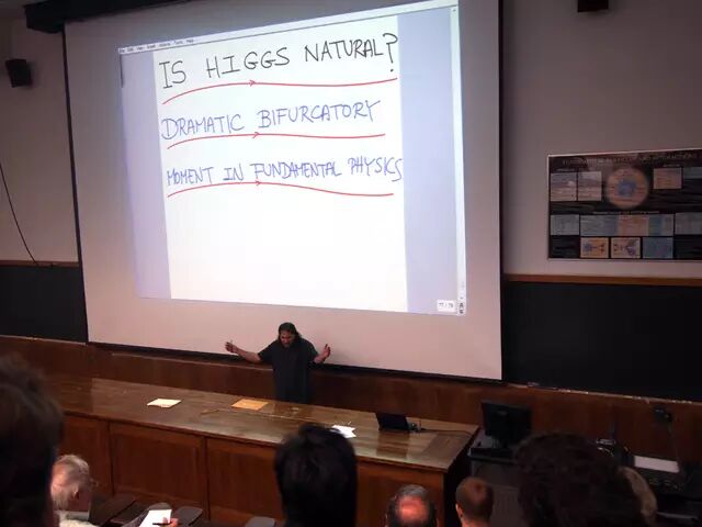 「宇宙循序而生,」他宣称:「宇宙毫无道理。」2012年7月,希格斯玻色子(Higgs boson)的发现造成举世轰动。一个存在将近五十年之久、关于基本粒子如何获得质量的理论终于获得证实。质量可使粒子形成大尺度的结构,例如星系或人。「我们在跟预期质量差不多的地方发现了希格斯玻色子,这是实验的胜利,是理论的胜利,也是物理确实有用的明证。」阿卡尼-哈米德告诉听众。