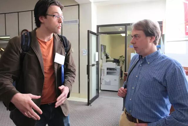 2013年布鲁克海文论坛:石溪大学博士后研究员柯尔廷(David Curtin,图左)与意大利国家核子物理研究所(National Institute for Nuclear Physics)的史楚米亚正在讨论后者的「修正自然性」构想。此一构想质疑希格斯玻色子质量自然值在计算上的长久假设。(Thomas Lin 摄/《 西蒙斯科学新闻》提供)