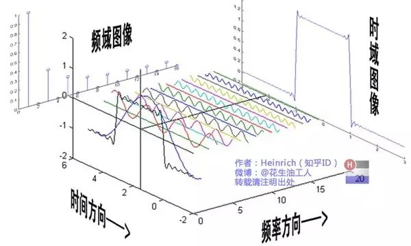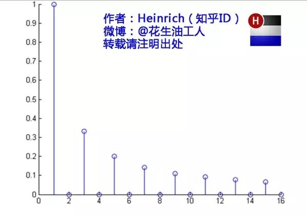 介绍完了频域的基本组成单元,我们就可以看一看一个矩形波,在频域里的另一个模样了: