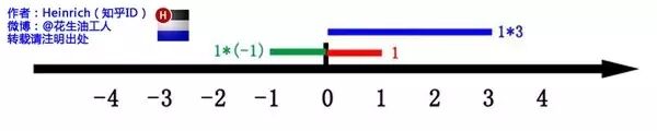 这里有一条数轴,在数轴上有一个红色的线段,它的长度是1。当它乘以 3 的时候,它的长度发生了变化,变成了蓝色的线段,而当它乘以-1 的时候,就变成了绿色的线段,或者说线段在数轴上围绕原点旋转了 180 度。