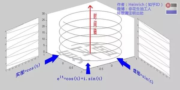 欧拉公式所描绘的,是一个随着时间变化,在复平面上做圆周运动的点,随着时间的改变,在时间轴上就成了一条螺旋线。如果只看它的实数部分,也就是螺旋线在左侧的投影,就是一个最基础的余弦函数。而右侧的投影则是一个正弦函数。