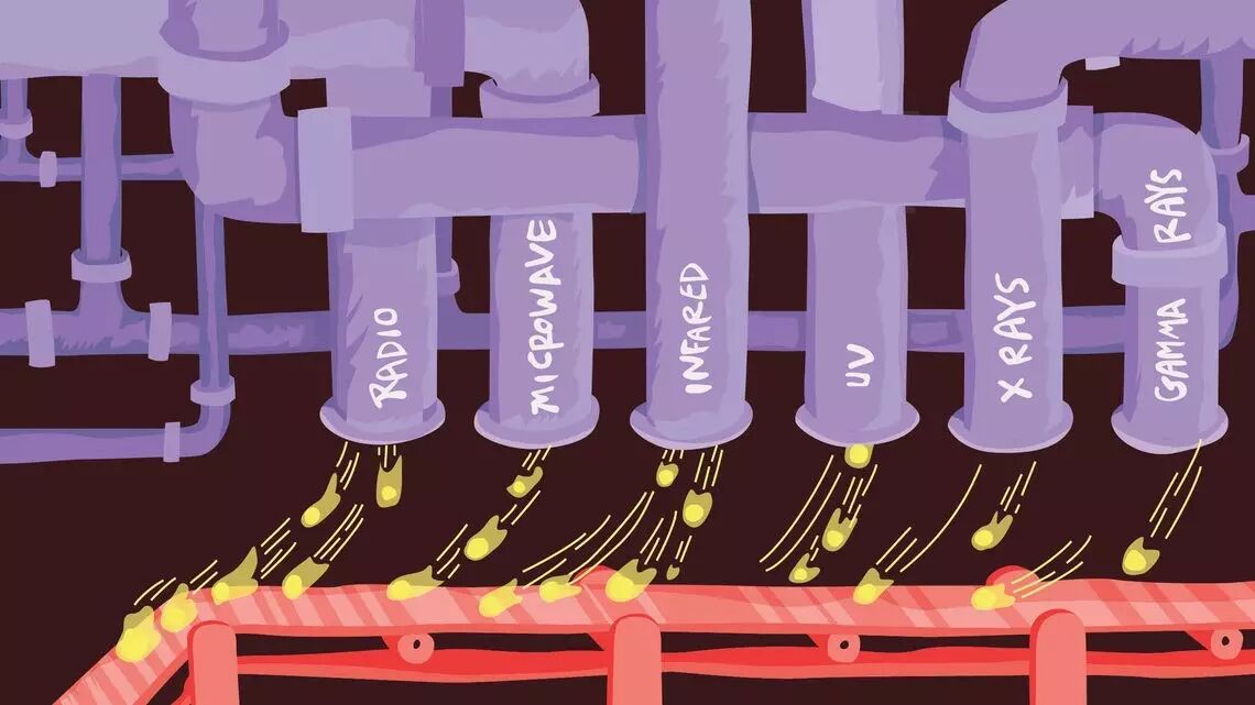 红光是波长最长的可见光,如果把它的光波继续拉长,就会得到红外线、微波(包括做饭用的微波)和无线电波。比紫光更短的波包括紫外线、X射线和伽马射线。波长也可以用来描述能量:无线电波的长波长拥有的能量低,而波长短的伽马射线能量最高。这也是伽马射线对于活体组织十分危险的一大原因。