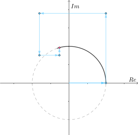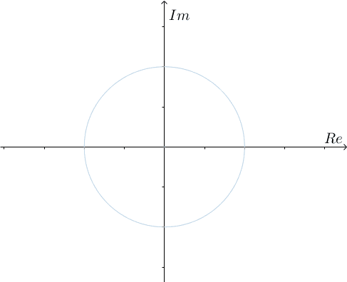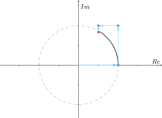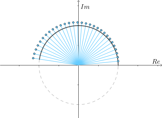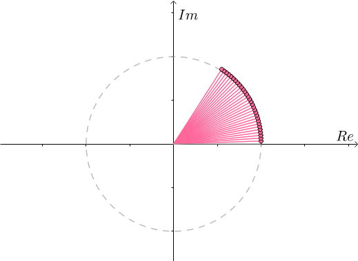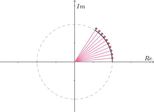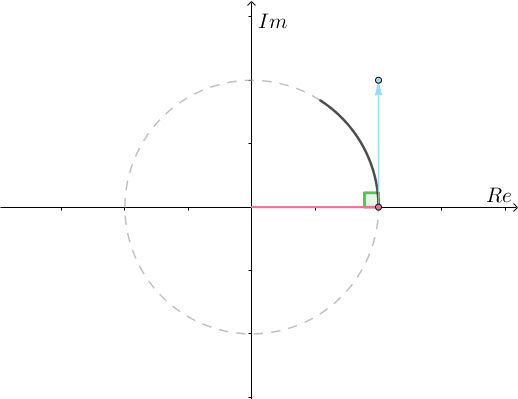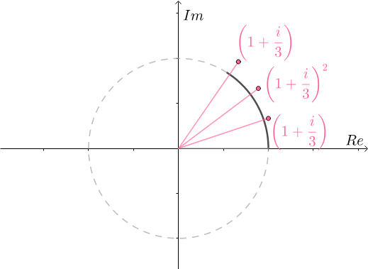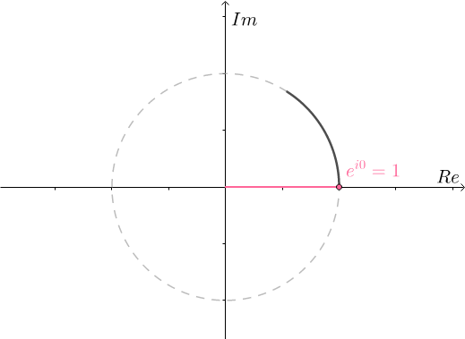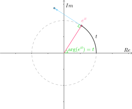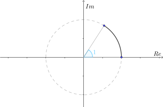 对应的是单位圆上幅角为1的点,所以先给个参照物,虚线是单位圆,实线对应的幅角为1: