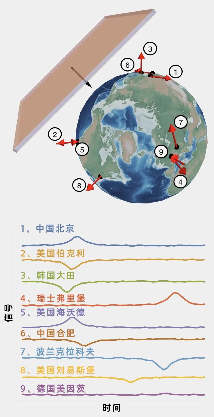 轴子或类轴子粒子的一个特点是,它们会在不同的区域形成比星系小但比地球大得多的“畴壁”。如果地球恰好遇上了这样一个轴子畴壁,它会逐渐地被GNOME网络探测到,并在磁强计中产生特征信号。这些信号甚至会以特定的方式相互关联——取决于畴壁移动的速度和它到达每个位置的时间。在最新的这项研究中,有9台磁强计提供了测得的轴子畴壁的数据。