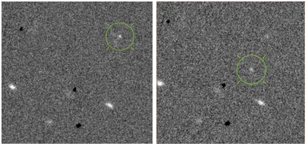 2010年9月16日晚,PS1相隔15分钟拍摄的2010 ST3小行星的两张照片(来源:PS1团队)