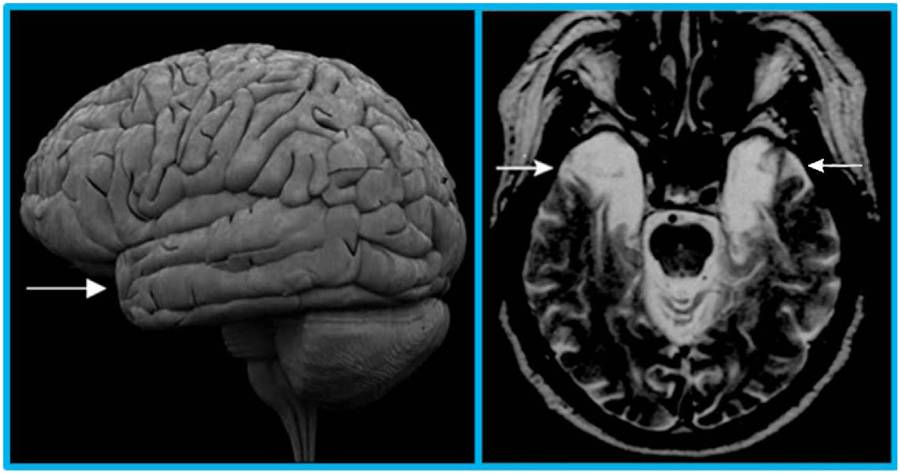 图1. H.M.患者在接受手术移除颞叶区后的脑扫描图。 左图中反映的是大脑外观的侧面图。 图中箭头指的是颞叶区的顶端。右图中是H.M.患者脑切面图,视角是从下往上观察。 箭头指出的颞叶区中较亮的部分是手术后残留的液体。因为移除了颞叶区那部分,H.M.患者再也不能回忆起手术前几年内发生的事情。此图来自参考文献[2]。