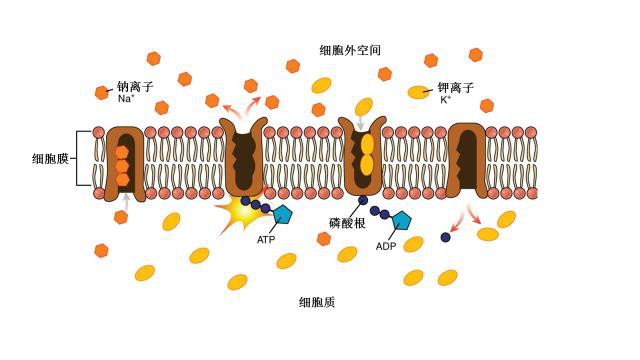 但即使是由磷脂组成的细胞膜也会有轻度泄漏。如果没有办法把漏进细胞的钠离子送出去,把漏到细胞外的钾离子收进来,细胞内钾高钠低,细胞外钠高钾低的状态还是不能维持。细胞解决这个问题的方法,是发展出能够把离子从膜的一侧泵到另一侧的离子泵。这样的离子泵有好几种,都用高能分子三磷酸腺苷(ATP)为能源,把钠离子泵出细胞,把钾离子泵进细胞。