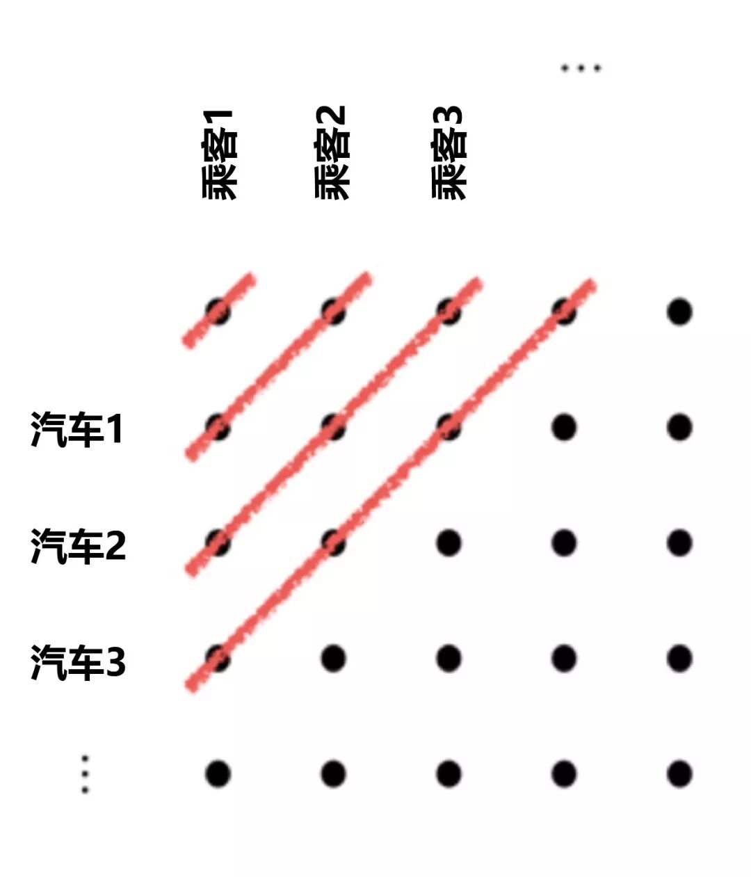 解决这个难题的诀窍是考虑对角线,也就是网格上从左下角延伸到右上角的直线。在这些对角线中,最左边的那条只会经过左上角的那个人,即0号巴士上的1号乘客——让这个人入住1号房间。下一条对角线会经过两个人(1号汽车上的1号乘客,0号汽车上的2号乘客):让这两个人入住2号和3号房间。下一条对角线将碰到三个人——让这三个人入住接下来的三个空房间,4、5、6号。按照这种模式,我们最终就能为耐心等候在停车场上的每个人都分配一个房间。