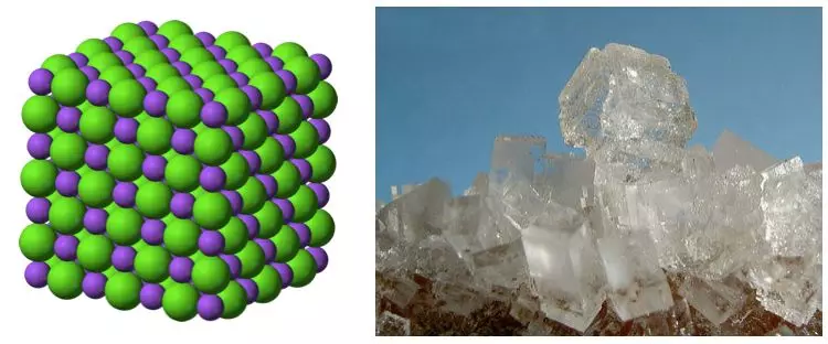 (左)NaCl的立体结构模型,绿色为氯原子,紫色为钠原子。(右)NaCl晶体(食盐)。| 图片来源:Benjah-bmm27 & W.J.Pilsak
