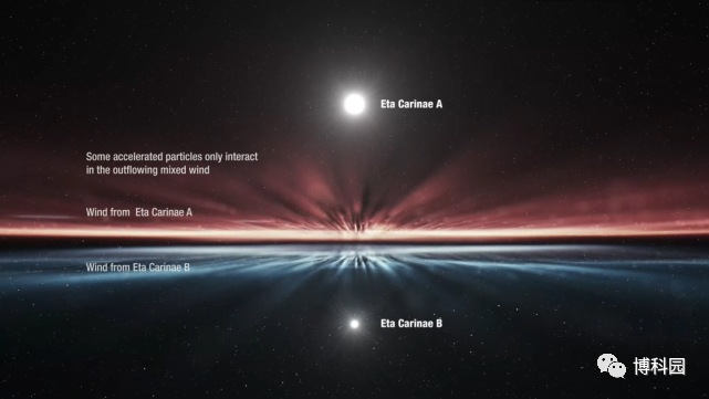 天文学家使用望远镜,现在证明了一种特定类型的双星,是一种非常高能的宇宙伽马辐射源。船底座埃塔双星位于7500光年外的南天船底座,根据收集的数据,它发出能量高达400千兆电子伏特(GeV)的伽马射线,大约是可见光能量的1000亿倍。研究由德国电子同步加速器研究所(DESY)的斯特凡·欧姆、伊娃·莱瑟和马蒂亚斯·富布林领导。并在《天文学与天体物理学》期刊上公布了他们在伽马射线天文台高能立体系统(H.E.S.S.)上的发现。船底座埃塔双是一个最高能的双星系统,由两颗蓝巨星组成,其中一颗质量约为太阳的100倍,另一颗质量约为太阳的30倍。这两颗恒星每隔5.5年在非常偏心的椭圆轨道上绕对方运行一次,它们之间的距离大约在太阳到火星和太阳到天王星的距离之间变化。这两颗巨大恒星都将密集的超音速带电粒子星风抛向太空。