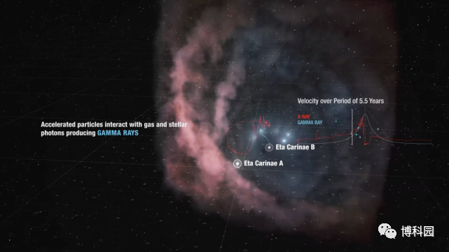 在这个过程中,在短短5000年左右的时间里,两者中较大的一个损失了相当于一个太阳的质量。较小的一颗产生快速恒星风,速度约为每小时1100万公里(约为光速的百分之一)。在这两种恒星风相撞的区域形成了一个巨大激波锋面,将风中的物质加热到极高温度。在5000万摄氏度左右,这种物质在X射线范围内辐射明亮。然而,恒星风中的粒子还不够热,不足以发射伽马辐射。然而,像这样的冲击区,通常是亚原子粒子被强大普遍电磁场加速的地方。