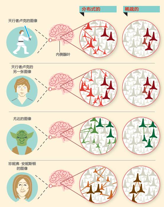 在大脑中,记忆如何编码?神经科学家提出了两种对立的理论,但一直没有定论。一种理论认为,每一个记忆——例如天行者卢克的图像——都是零散地分布式存储在数百万甚至数十亿个神经元中。近年来,另一种理论已经得到更多科学家的认可。这种理论认为,神经元对记忆的编码是“稀疏”的,大约几千个神经元就可以表示一幅图像。当卢克的图像出现时,不管距离远近,这些神经元中的每一个都会兴奋。这群神经元中的一部分(不是全部)也会对与卢克有关的另一个角色——尤达的图像兴奋。与此类似,另一群神经元会对女影星珍妮弗· 安妮斯顿的图像兴奋。