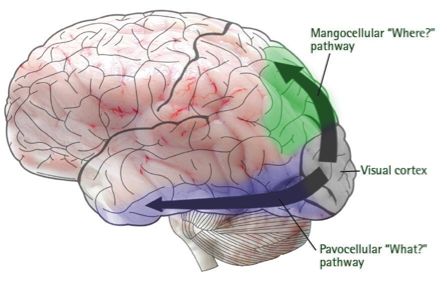 再往下传的时候,顺着上面绿色走的,是分析视觉信号所带来的“Where”也就是位置信息;而往下方蓝色走的,分析的是关于“What”信息,也就是去识别和描述看到的是什么东西?