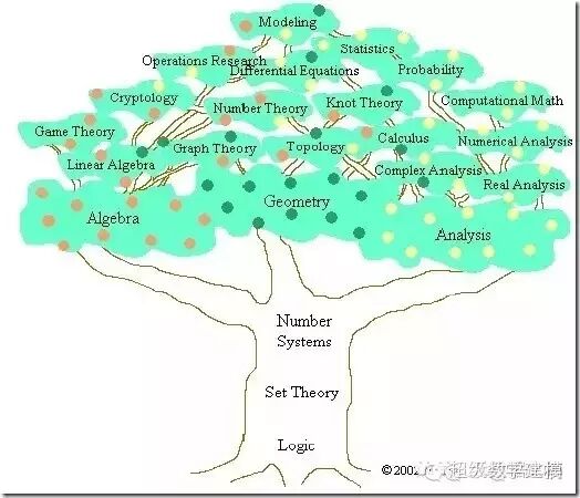 在集合论的基础上,现代数学有两大家族:分析(Analysis)和代数(Algebra)。至于其它的,比如几何和概率论,在古典数学时代,它们是和代数并列的,但是它们的现代版本则基本是建立在分析或者代数的基础上,因此从现代意义说,它们和分析与代数并不是平行的关系。