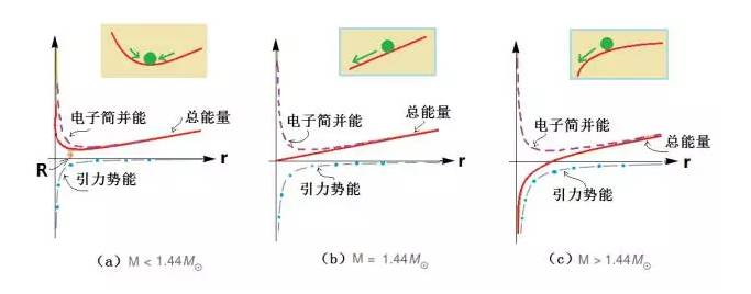 图3中画出了电子简并能及引力势能随着恒星半径r而变化的曲线。图a、b、c分别表示恒星的质量小于、等于、大于1.44太阳质量时的三种情况。电子简并能曲线不受恒星质量的影响,在三种情形是相同的,引力势能则不同,它与恒星质量大小密切相关。引力势能为负值表明是互相吸引,电子简并能的正值表示电子之间统计意义上的“排斥”。三个图中均以红色曲线描述总能量,它是由电子简并能和引力势能相加而得到的。从图a中可见,当恒星的质量小于钱德拉塞卡极限时,总能量在R处有一个最小值,能量越小的状态越稳定,说明这时候恒星是一个半径为R的稳定的白矮星。而当恒星的质量等于或大于钱德拉塞卡极限时,半径比较小时候的总能量曲线一直往下斜(从右向左看),没有极小值,因为系统总是要取总能量最小的状态,就将使得恒星的半径越变越小而最后趋近于零,也就是说,产生了引力塌缩。这三种情形可以类比于每幅图右上方所画的小球在地面重力势能曲线上滚动的情况。只有在第一种情况下,小球才能平衡并达到静止。