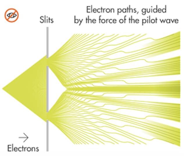 德布罗意-玻姆理论,又称为导航波理论,在玻姆力学中,量子物体被当做是经典粒子,电子始终拥有确定的位置,即使该位置无法被观测者察觉。该电子的位置会受到“导航波”推动的影响。一个电子只能穿过一条狭缝,但导航波同时穿过两条狭缝。导航波的干涉带来了探测屏幕上的干涉图案。在狭缝的测量会导致导航波的“坍缩”,因此就可以知道电子的路径了。