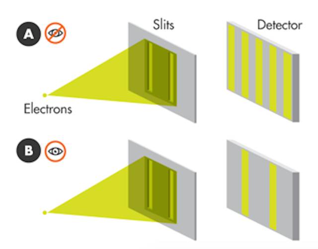△ 双缝实验。A:不观测电子通过哪条狭缝的情况下,会在探测屏上形成干涉条纹。B:一旦进行观测,干涉条纹就会消失。(图片来源:Quanta)