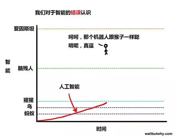 但问题是,从智能的大局来看,人和人的智能的差别,比如从最愚笨的人类到爱因斯坦的差距,其实是不大的。所以当人工智能达到了脑残级别的智能后,它会很快变得比爱因斯坦更加聪明: