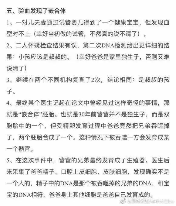 这样的胚胎成长起来之后,体内会有2套不同的DNA系统。一个是自己的,一个是吸收了自己双胞胎兄弟的胚胎之后长成的器官。