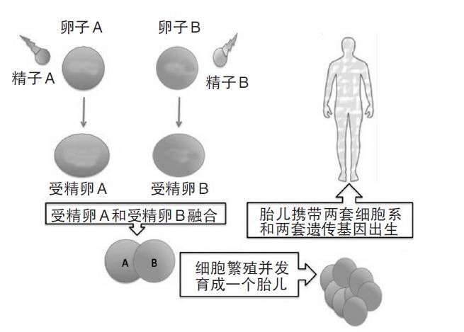通俗一点说, 本来这个爸爸是有一个跟他一起的受精的双胞胎亲兄弟。但是随着孕育的推进,两个受精胚胎里发育得比较弱的那个,可能会死去消失。另一个强一点的胚胎就有可能过来把弱的那个吞噬吸收掉,最终两个胚胎嵌合成一个胚胎。