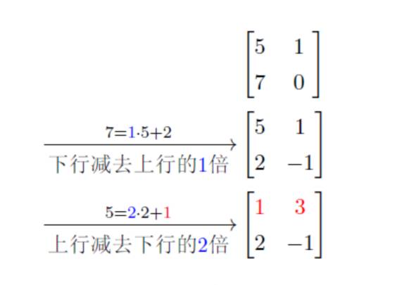 不同于欧几里得的辗转相除,秦九韶‐黄宗宪的方法是用矩阵。首先写出一个 2 行 2 列的阵