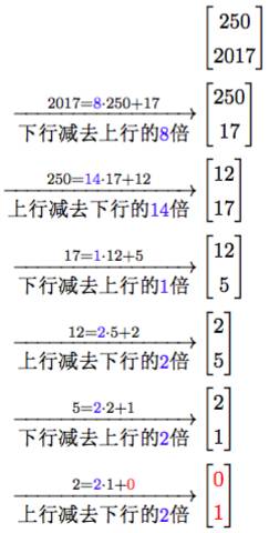 不难发现,秦九韶‐黄宗宪的求一术与求最大公因子的欧几里得算法是相通的。作为例子,我们用矩阵格式写出求250与2017的最大公因子的过程如下: