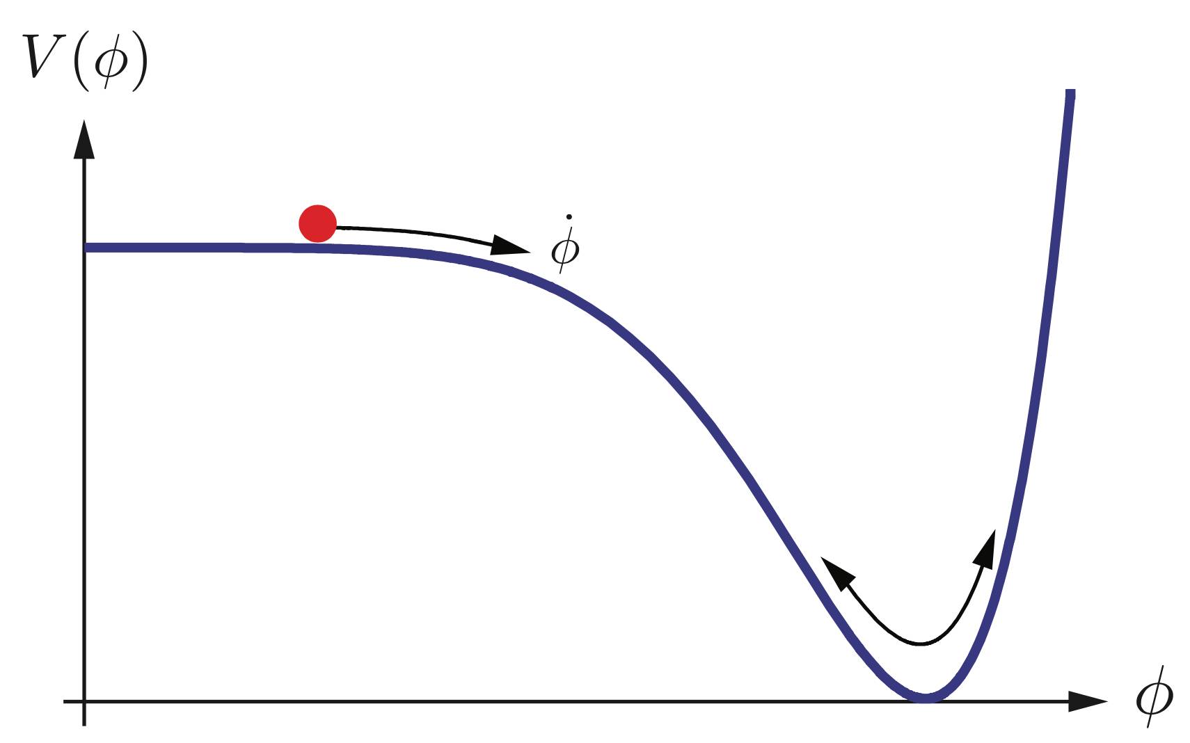 △ 慢滚暴胀模型。φ是一个标量场,即暴胀子。在暴胀后,暴胀场φ会在势能V(φ)的底部振荡。为了避免暴胀结束后,宇宙中空无一物,暴胀子必须跟标准模型的场进行耦合。因此暴胀场的能量才能转换变成普通粒子。(图片来源:D.Baumann)