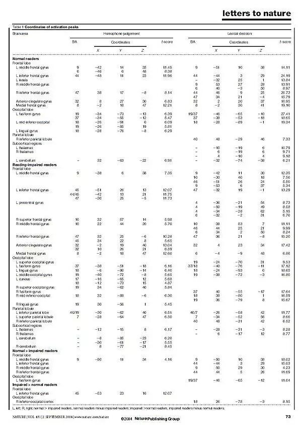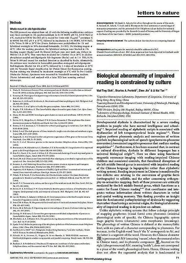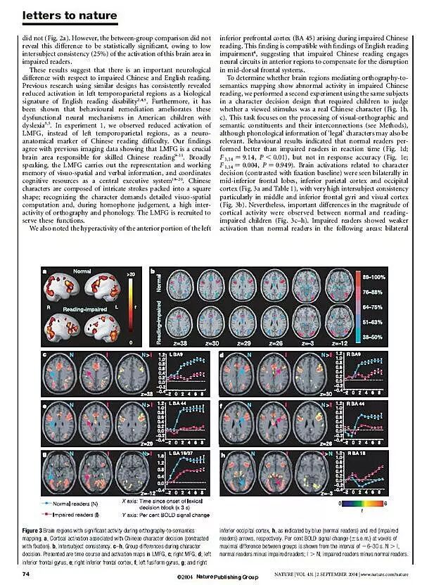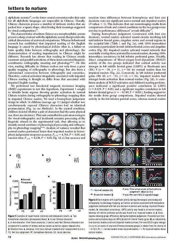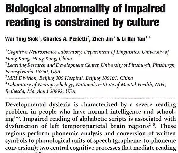 香港语言认知神经科学实验室,匹兹堡大学学习研发中心,北京解放军306医院,核磁共振室,美国国家精神卫生研究所,国立卫生研究院,神经心理学实验室四个研究机构合作研究,发表在Nature杂志上的Biological abnormality of impairedreading is constrained by culture一文,揭示了使用表意象形文字的中国人与使用拼音文字的西方人的大脑中,语言障碍区不在同一个地方,中国人有独特的语言区。该项发现对临床外科医生将有很大帮助,因为很多尖端的颅脑手术技术都是需要准确定位,如果医生了解了不同语言人群大脑语言区的确切位置,就可以减少大脑功能区受损。因此,该研究成果在世界科技类最具权威的刊物美国《自然》杂志上发表公布。