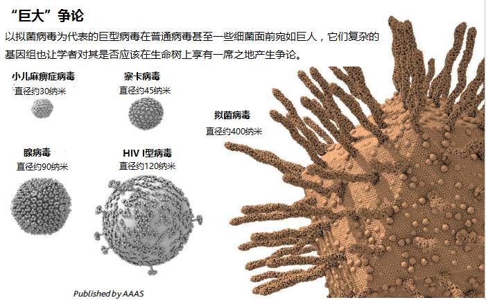 一般的病毒非常的小(直径大约30-150 纳米,是细菌的十分之一左右),通常只有几个到几百个基因(作为对比,肺炎双球菌有大约2300个基因,人类有大约2.5万个基因)。而拟菌病毒直径超过400纳米,拥有2500个基因。单就数据而言,拟菌病毒的这两方面可是超过不少微生物。自此,越来越多类似的巨型病毒被发现,包括比较有名的潘多拉病毒和阔口罐病毒。更为重要的是,这些巨型病毒拥有蛋白质合成相关的基因,而蛋白质合成可是生命形态的标志之一,这引起科学家们对病毒起源问题的兴趣。