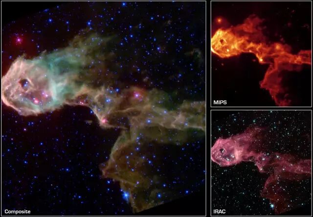 图18、螺旋星云。蓝色为3.6-4.5微米波,绿色为5.8-8微米波,红色为24微米波。