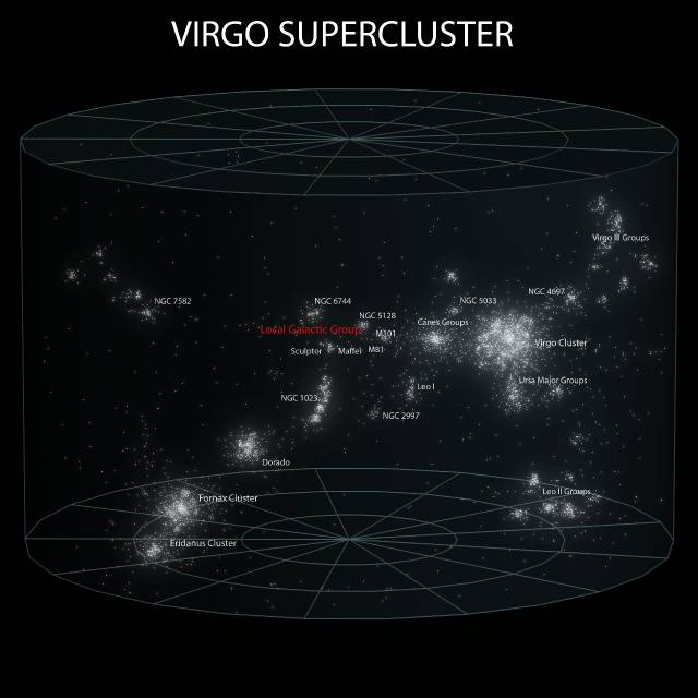 但是,本星系群也仍然只是我们近邻的一个小部分。往更远处看,我们发现银河系只是一个更大的星系群——室女座超星系团——的一部分。