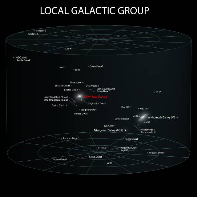 我们的近邻包括大麦哲伦星云、小麦哲伦星云、以及仙女座大星云(M31,离我们最近的漩涡星云)。除此之外,还有大约50多个其他星系,它们共同环绕着一个中心运动,形成一团,我们称之为“本星系群”。