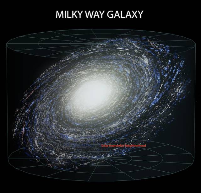 我们是生活在银河系盘面里的,在一个离银河系中心大约2.6万光年的地方。我们不可能站在自家屋子里给自己的房子拍一个全景照,同样在我们有能力飞出银河系之前,也不可能拍出一张银河系的照片。这就意味着,你曾经看到的那些据说是银河系的旋涡星系,要么是别的星系,要么就是出自哪位艺术家之手画出来的。