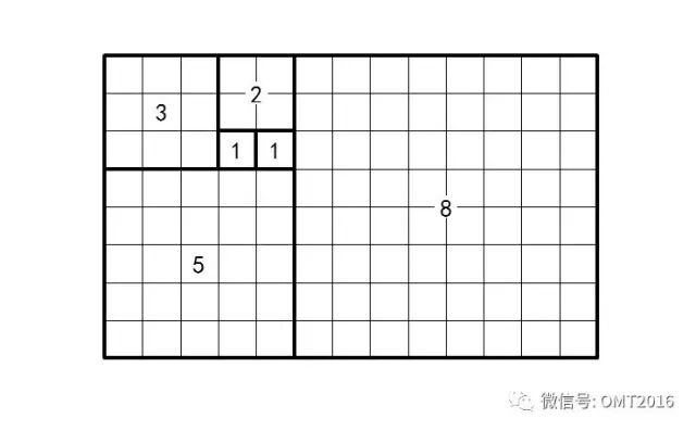 用斐波那契数列的前六个数 1, 1, 2, 3, 5, 8 为边长的 6 个正方形,可以拼成一个边长为 8 和 13 的矩形: