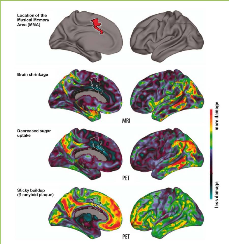 另外从图2最后一排造影中可以发现,音乐记忆区的蛋白斑和其他部分相比,并没有显著减少。然而阿尔兹海默症患者的脑组织通常是从蛋白斑增加开始,之后糖摄入不足,到最后脑组织萎缩。蛋白斑的出现甚至在记忆损伤之前。因此,研究者们认为,人脑中的音乐记忆区并没有像其他如枕叶区或者长期记忆区域那样快速地被损害。事实上,在整个阿尔兹海默症进程中,音乐记忆区可能是最后被影响的那部分脑组织。