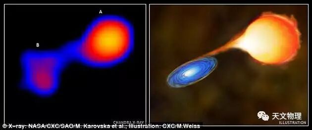 右图是共生恒星中的一颗高进化红巨星,左图是共生恒星中一颗白矮星。