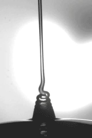 根据重力、惯性力和粘滞力(摩擦力)三种力之间不同的平衡情况,下落的粘性流体会出现4种不同的盘绕形态。在这些实验中,作者从不同高度将硅油滴落在金属板上。控制硅油细流的直径为0.7毫米,流动速率为每分钟0.23毫升。实验中使用的硅油粘度较大(100 000厘斯,cSt),一汤匙这样的硅油完全滴下需要几分钟时间。作为比较,室温下水的粘度为1 cSt,蜂蜜为10 000 cSt。