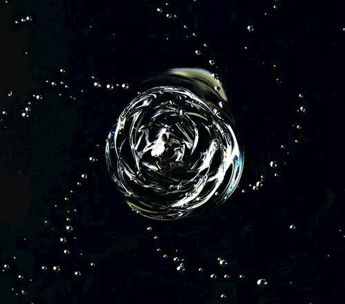 首先是一种美丽的气泡螺旋波纹,在液体卷绳向四周散开时形成的一层薄薄的液面上,会出现这种现象。产生的原因是,连续产生的盘卷结构中,相邻的两环会稍微错开一些,将小气泡锁在中间,从而产生这种螺旋。不过目前我们还不清楚为什么恰好会形成实验所观察到的这种螺旋形状,以及为什么这种现象只在很窄的粘度、流动速率和下落高度范围内才会出现。