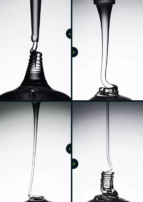 a  滞留。在流体粘度相对较低、下落高度较低、流动速率较高的情况下,流体垂直下落,在金属板上向四周均匀扩散。生活中常见的流体,比如水和橄榄油,也会这样。尽管如此,如果条件恰当,这些流体也可以形成盘绕结构。比如,让橄榄油从10厘米的高处以每40分钟1毫升的速度向下滴落,卷绳现象就会出现。