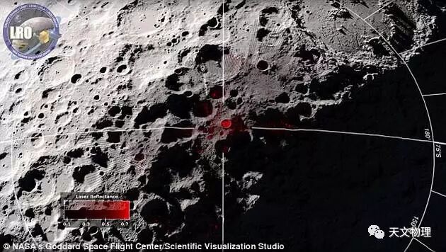 研究人员使用美国宇航局月球勘测轨道器的激光仪测量了反射激光光线,这些数据表明冰或者其它高反射物质的存在。图中呈现的是月球表面的反射率,反射率最高的区域标注为亮红色。
