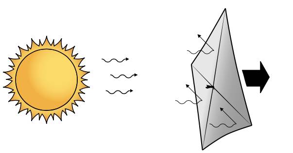 太阳帆是个巨大镀铝的帆,它像帆船利用风的压力前进一样,利用太阳光的压力来加速自己航行在宇宙间。当帆反射太阳光时,由于每个光子都有一定的能量和动量,帆就会获得一定的动量。换句话说,光对帆施加了压力,简称光压。光压虽然很小,但是可以连续不断的推动太阳帆航行在太空中。