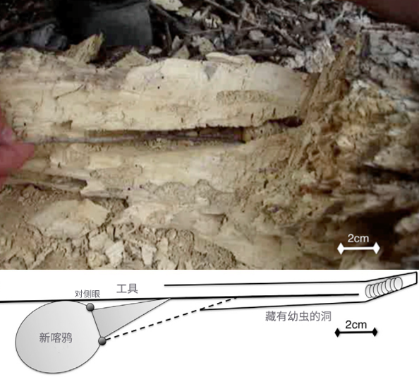 卡采尔尼克用木条戳洞里的幼虫(上)和新喀鸦在类似状况下使用工具时的简易模型示意图(下)。研究团队综合了该模型中的各个参数对取食过程进行了分析。大部分情况下,和工具同侧的眼睛看不到孔洞深处的情况,任务主要是单眼完成的。图中比例尺为2厘米。图片来源:研究论文。汉化:Paradoxian