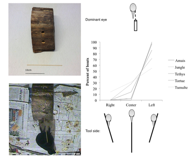 大部分使用工具的动物都有特定的偏好方向,例如人类有90%都是右撇子。而有意思的是,对工具使用方向的偏好性在新喀鸦中似乎是随机的。研究者们推测,这有可能是因为鸟类必须用嘴来处理工具,眼睛则不得已和嘴的运动同步——它们的上肢早就演变成了翅膀,嘴和爪代替了我们“手”的功能。这种同步带来的眼优势牺牲了立体视觉,为其它的行为带来了潜在的不变;这可以解释为什么眼优势和使用偏好并没有固化成先天特征,而是在后天发展中随机选择方向。