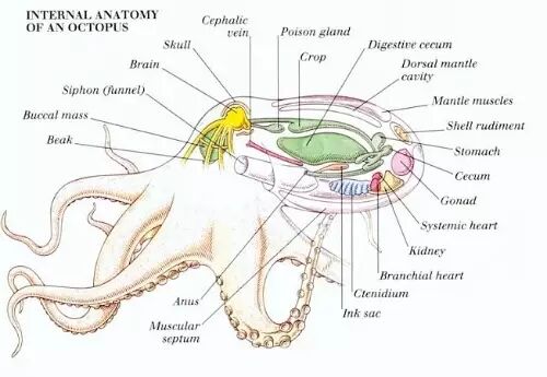 首先,它们的生理构造奇特。章鱼拥有三颗心脏,两颗负责给鳃供血(鳃心脏),一颗负责给全身供血(体心脏)。它们还具有鹦鹉般的喙和八条布满了丰富神经和吸盘的手臂。